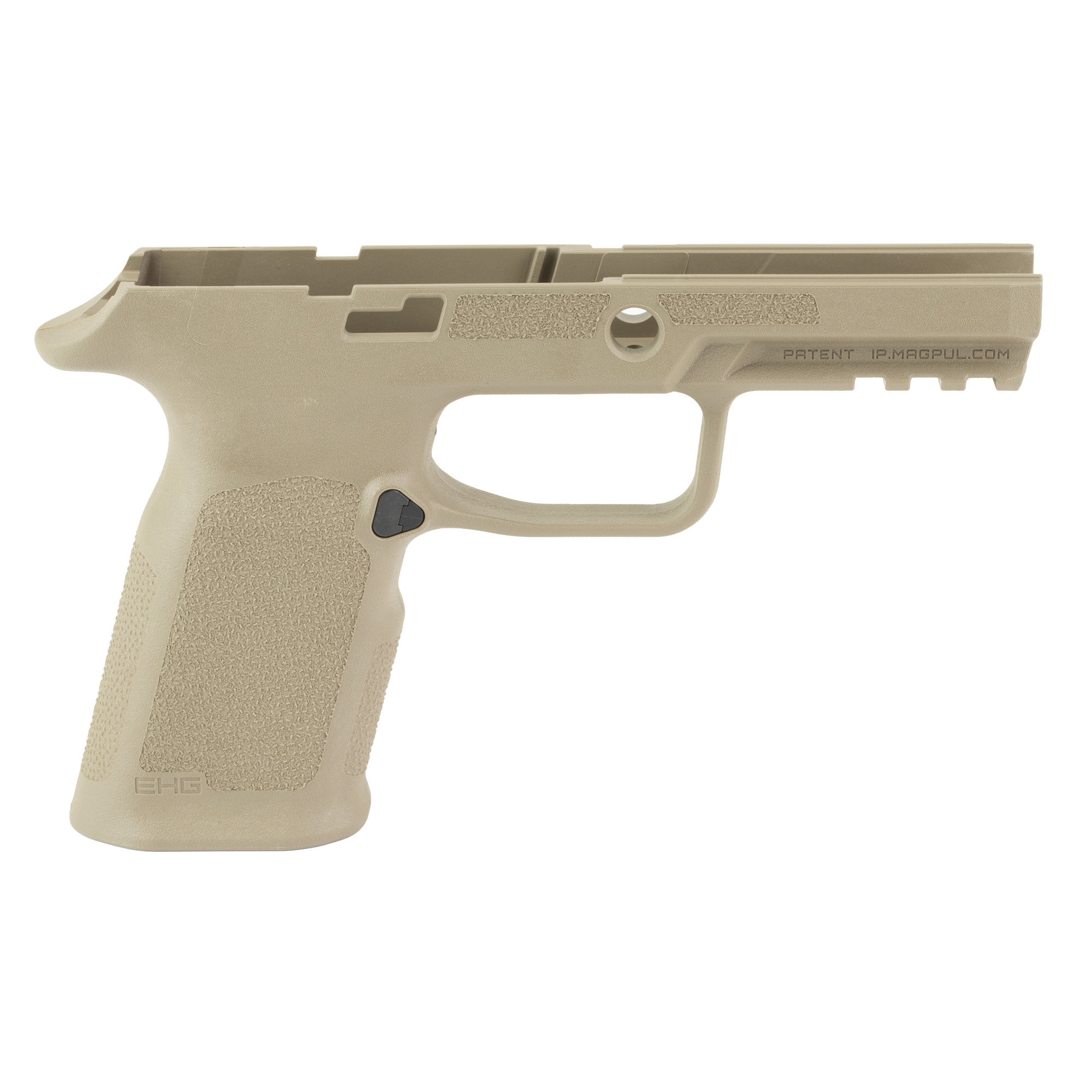 The Magpul EHG SG9 Full Size grip frame for the SIG Sauer P320 functions with OEM P320 trigger modules, OEM 17-round magazines and magazine base plates, and small components and accessories. The EHG SG9 features an integral carry-sized magazine well flare and includes a Picatinny rail for lights or lasers. As an added bonus, the frame also comes with the Magpul-designed Magazine Release installed, which is reversible for left-handed shooters. This steel magazine release is finished in QPQ to resist corrosion and wear, and the release’s contoured surface features custom jimping to ensure positive engagement with the shooter’s finger when changing magazines.