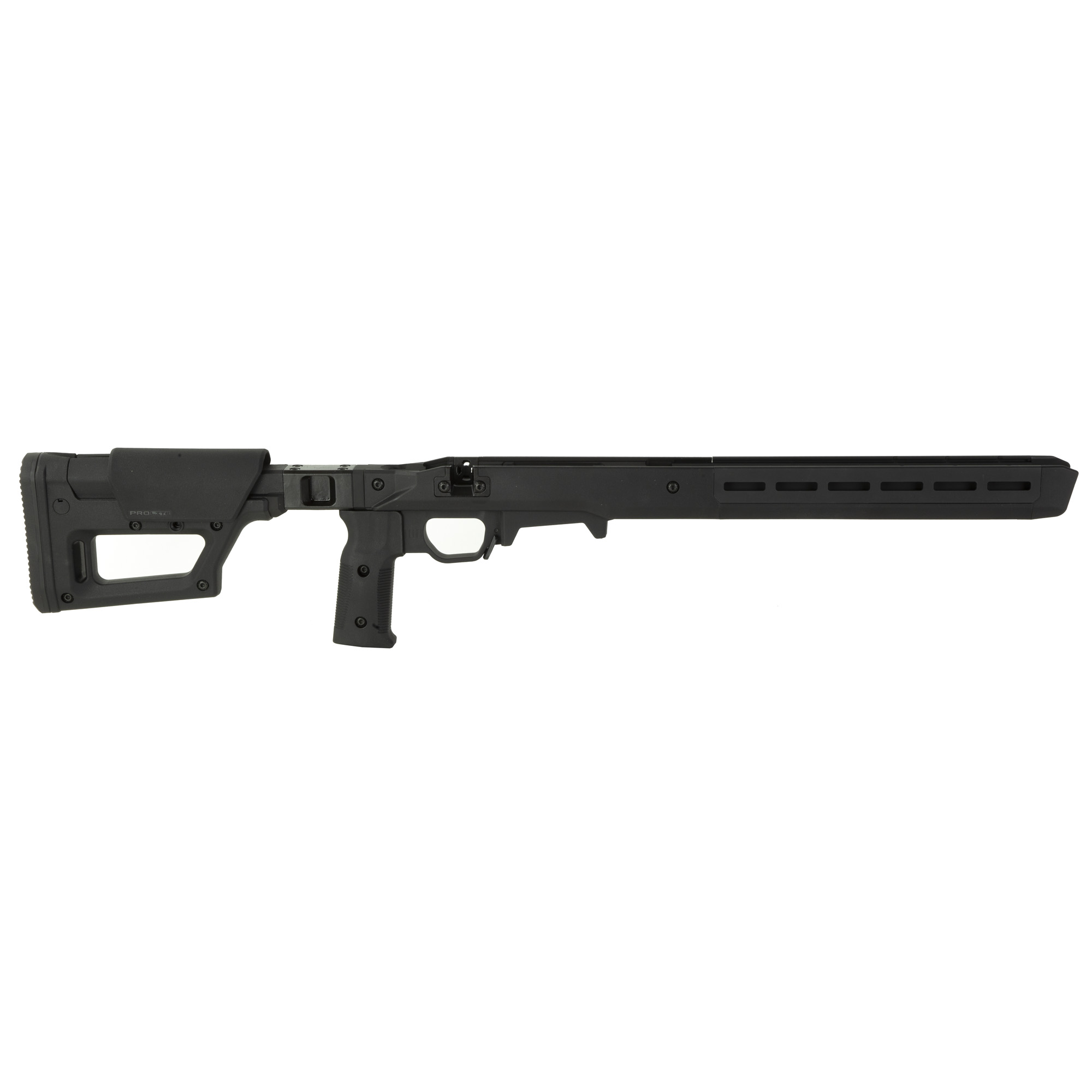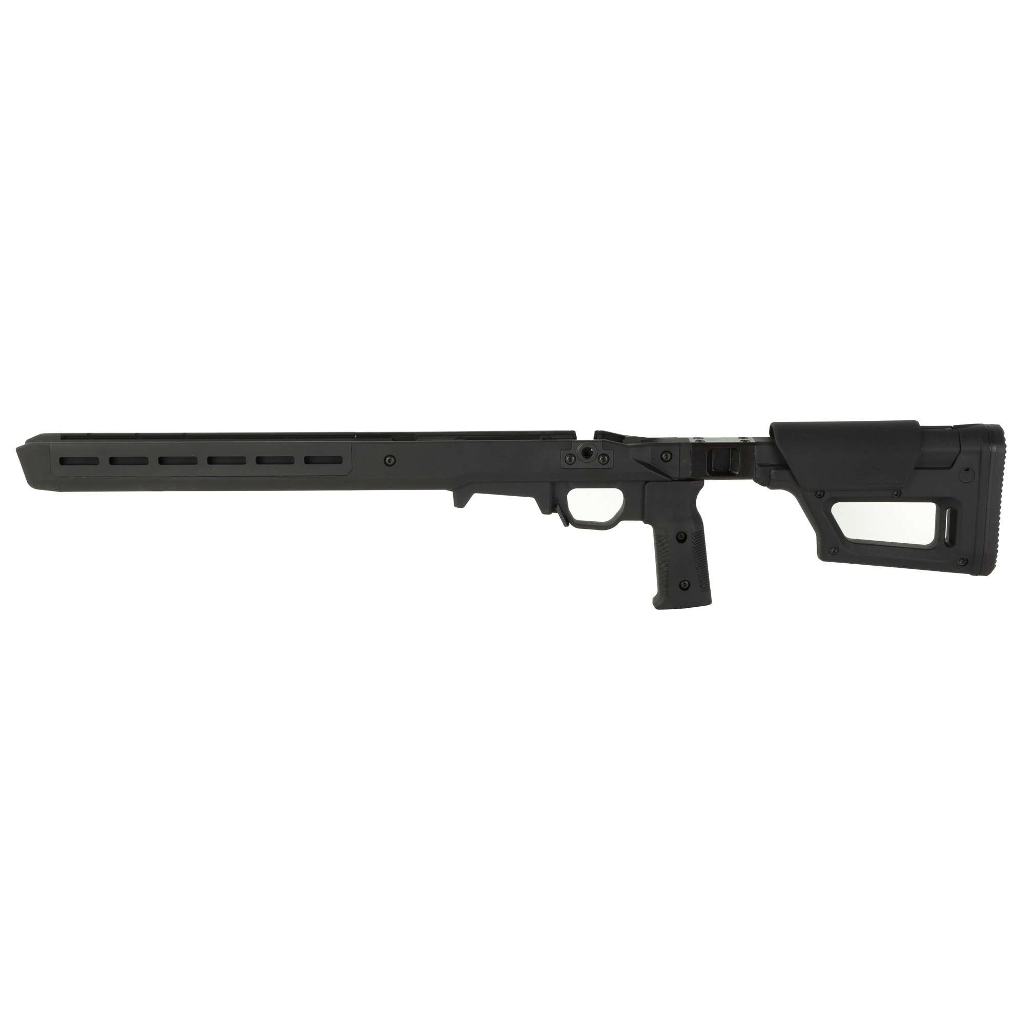The Pro 700 Lite surrounds it’s billet aluminum chassis with Magpul polymer for enhanced ergonomics, strength, and sound mitigation. Built around the user, it is fully ambidextrous at the swap of a bolt retainer plate, and the vertical grip can be adjusted for various trigger reaches. The included large trigger guard can accommodate usage with gloves and aftermarket triggers. The AICS-pattern magazine well features an ambidextrous mag release and has a front barricade stop to prevent the rifle from resting on the magazine when using barricade support. Up front, there are numerous M-LOK slots (left-6/right-6/bottom-7) allowing you to mount whatever accessories your loadout calls for. As the name suggests, the Pro 700 Lite blends the original Pro 700 Chassis and the PRS Lite stock to create a simplified rear end with a strong foundation – passing on the value and weight savings to you. The streamlined design weighs in at 4.4 pounds, a full pound less than its predecessor, but still packs a complete set of features that elevate your rifle’s performance.