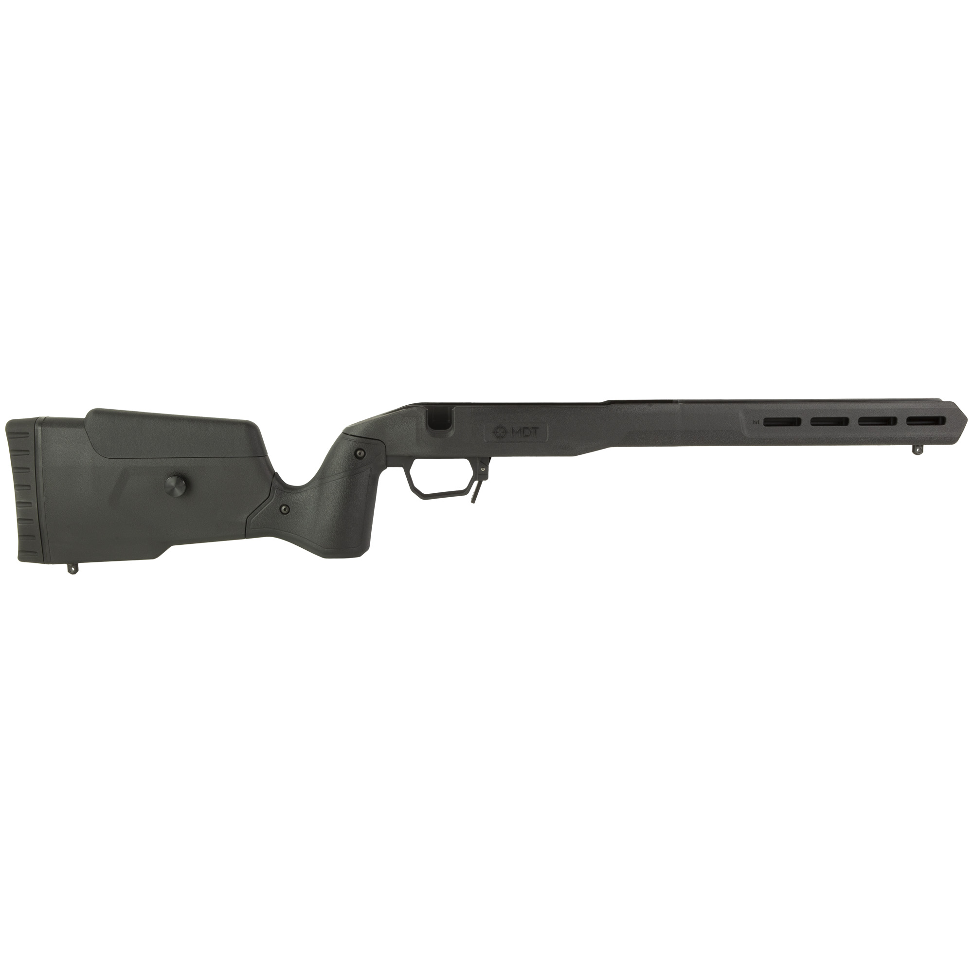 Get more accuracy out of your factory rifle by upgrading with the Field Stock. The traditionally shaped polymer stock provides comfort and warmth in cold weather. Improve accuracy with the aluminum v-block bedding and a free-floating barrel. The adjustable buttstock allows you to be more comfortable for long-range shots. The Field Stock is configurable for any shooting discipline. In addition to the included sling swivel studs, the M-LOK forend enables you to customize accessories for hunting, competition, or casual long-range shooting.