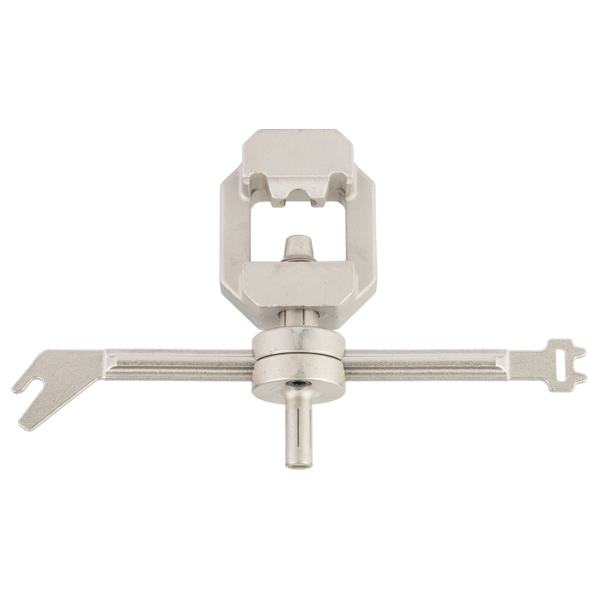 Designed to perform a wide variety of functions on a wide variety of AK and other AK-type rifles. Nickel-plated finish for superior corrosion resistance. Heavy-duty design, made from 4140 steel for durability. Main body built to prevent flex and assist in loosening tough front sights. Long handle removable wrench provides excellent leverage to ease movement of the pusher. The body features a built-in pointer and markings on the pusher to track movement when adjusting windage and elevation. The handle includes a gas tube wrench, a handguard cap lever wrench, and multi-function nubs for muzzle brake detents or recoil button compression. Each hash mark adjusts bullet impact by approximately 1.0 MOA, depending on barrel length.