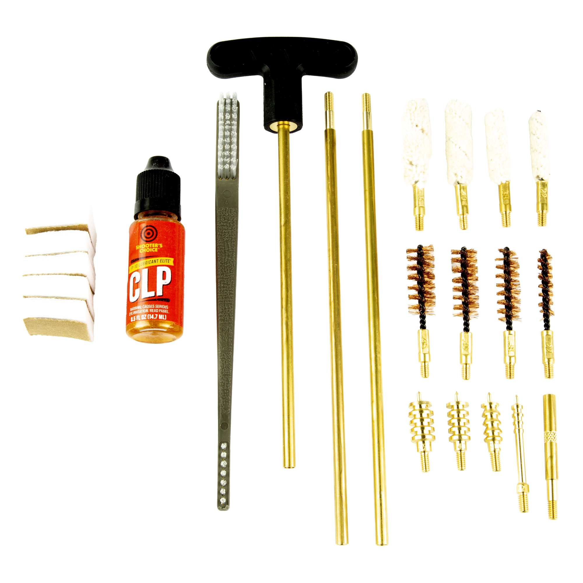 - .22, 9mm, .40 & .45 cal bronze bore brushes, cotton mops and pierce point jags with size marked on stem