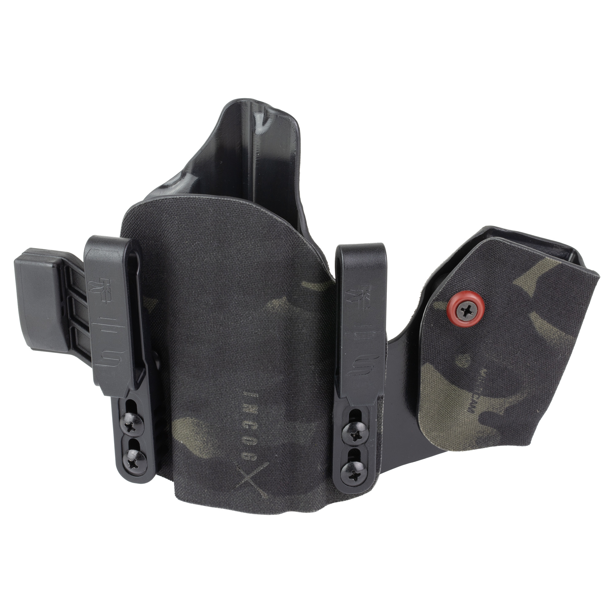 An ergonomic, mission-adjustable, RDS-compatible, multi-positional, deep concealment IWB hybrid thermoplastic holster. Its distinctive features enable concealed carry for a wide range of handgun fits from various carry positions while allowing a full firing grip prior to drawing. The design includes passive retention and adjustable tension, enabling a finely tuned fit and smooth draw. This evolution of the IncogX features a series of clips that provide more adaptability to the user while maintaining the original goals of improved grip, concealment, and function. The clips open outward and slide down with the holster, naturally locking over the belt. An actuated finger tab flexes to open, allowing quick installation or removal from the belt. An improved clip strut design combines functionality with customized concealment shims that can be easily installed or removed without tools. All IncogX models come with clip strut shims in three different concealment sizes: 1/8″”, 1/4″”, and 3/8″”.